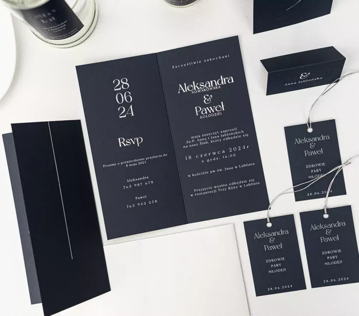 Nasze wyjątkowe zaproszenia ślubne z kolekcji Elegant Silver stanowią niepowtarzalną kombinację elegancji i szyku. Ich granatowy kolor nadaje im wyjątkowego uroku, wprowadzając do ceremonii nutę klasyki i stylu. Wyróżniające się, srebrzone imiona nowożeńców sprawiają, że kartka wygląda niezwykle dostojnie. Została ona wykonana z grubego papieru o imponującej gramaturze 350 g i o wymiarach 99×210 mm. Te zaproszenia na wesele emanują solidnością i prestiżem, zapewniając niezapomniane wrażenia od pierwszego spojrzenia. Prosta i lekka czcionka dodaje im również subtelnego wdzięku i sprawia, że informacje są czytelne i klarowne. To zaproszenie na ślub, które nie tylko informuje, ale również zachwyca swoim wyjątkowym stylem i starannością wykonania.