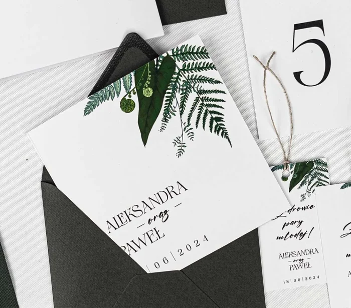 Zaproszenia ślubne z kolekcji Paproć wykonano z białego, gładkiego papieru o gramaturze 350g. Wymiary produktu wynoszą 140x140mm, a wymiary koperty 150x150mm. Wszystkie elementy zaproszenia mogą zostać poddane personalizacji.