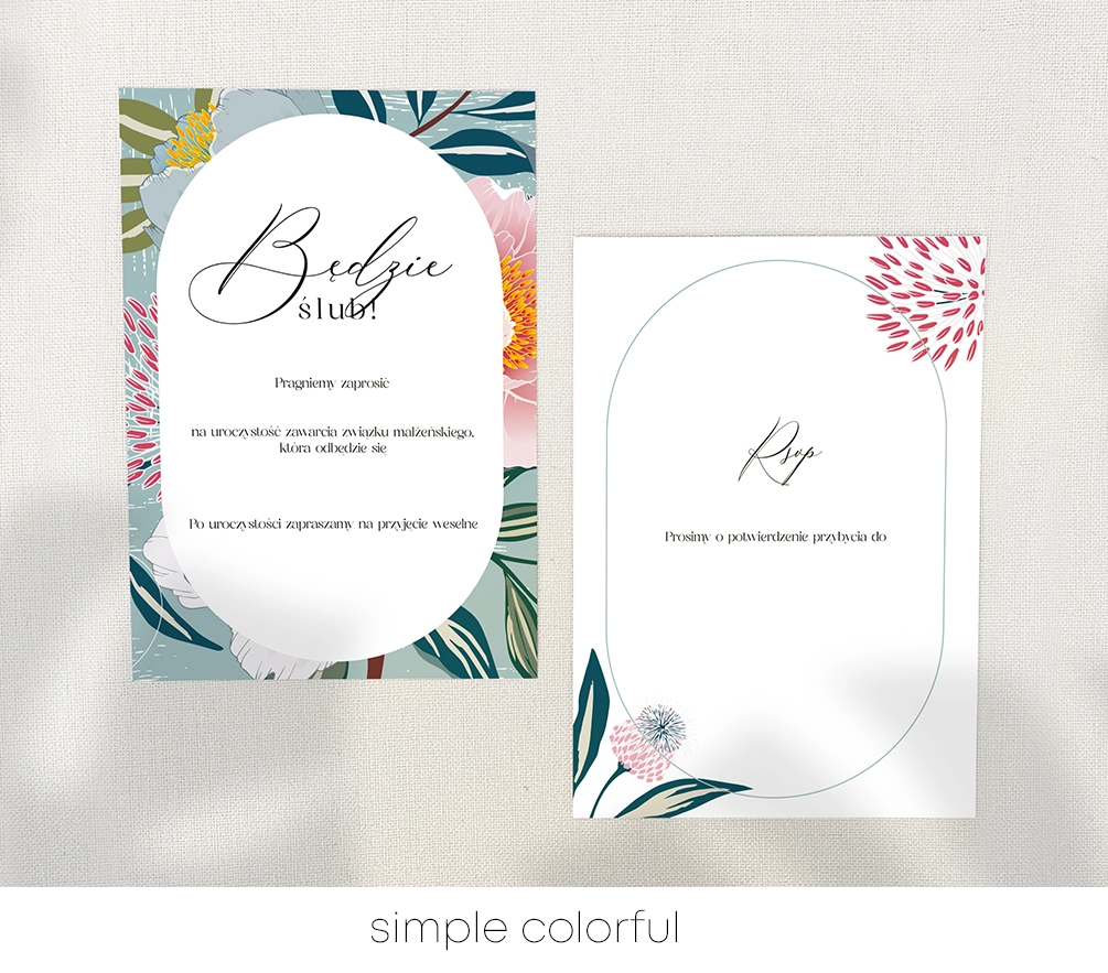 Zaproszenia ślubne z kolekcji Simple wykonano z gładkiego, białego (barwionego w masie) papieru o gramaturze 350 g. Wymiary karty wynoszą 120×170 mm. Zaproszenie zadrukowano dwustronnie. Wykorzystano nadruk cyfrowy, trwały.